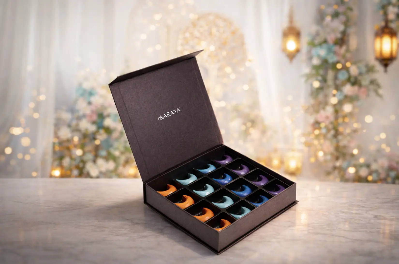 The AARAYA® Celestial Crescent Ramadan Chocolate Collection is a radiant expression of artistry, symbolism, and refined indulgence. Inspired by the celestial beauty of the crescent moon, this luxurious 16-piece chocolate collection celebrates Ramadan through flavour, design, and elevated craftsmanship.