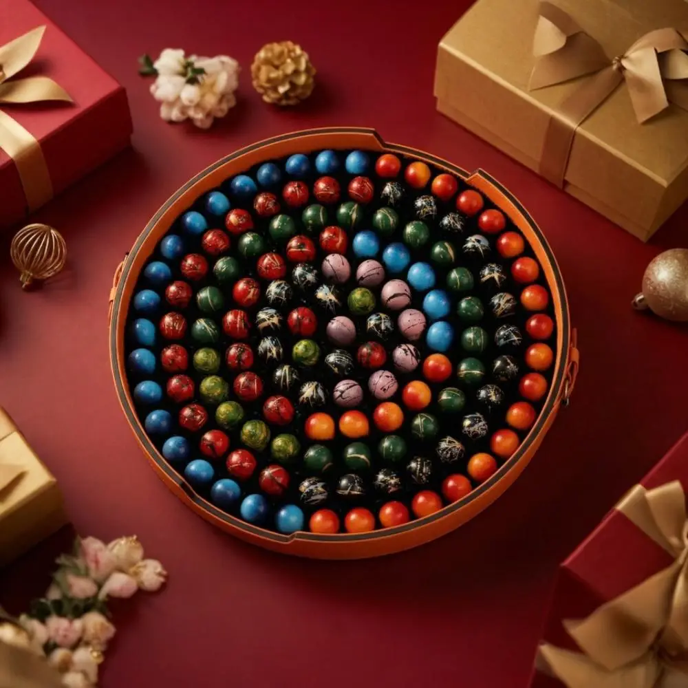 Featuring 130 handcrafted truffle chocolates arranged in a stunning round luxury tray, this festive masterpiece is designed to impress at first glance and delight with every bite.