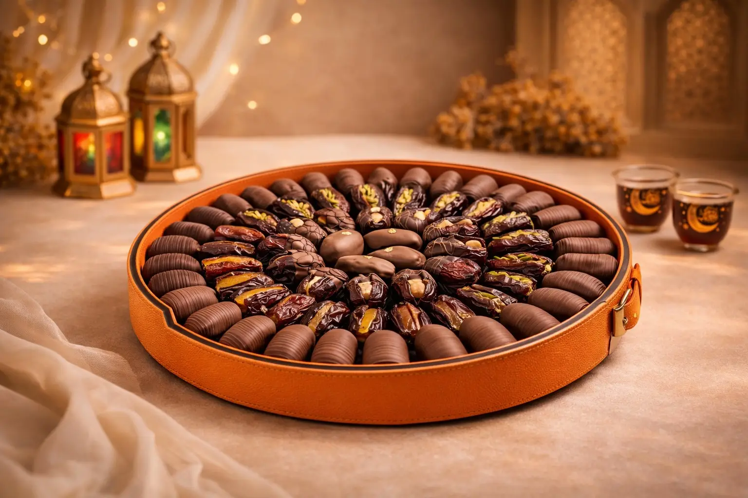 The AARAYA® Luxury Dates Assortment Tray is a refined expression of Ramadan hospitality, tradition, and elevated indulgence. Designed for grand Iftar gatherings and premium gifting, this luxurious round tray features a generous assortment of premium Medjool dates delicately filled and chocolate coated with gourmet flavours.
