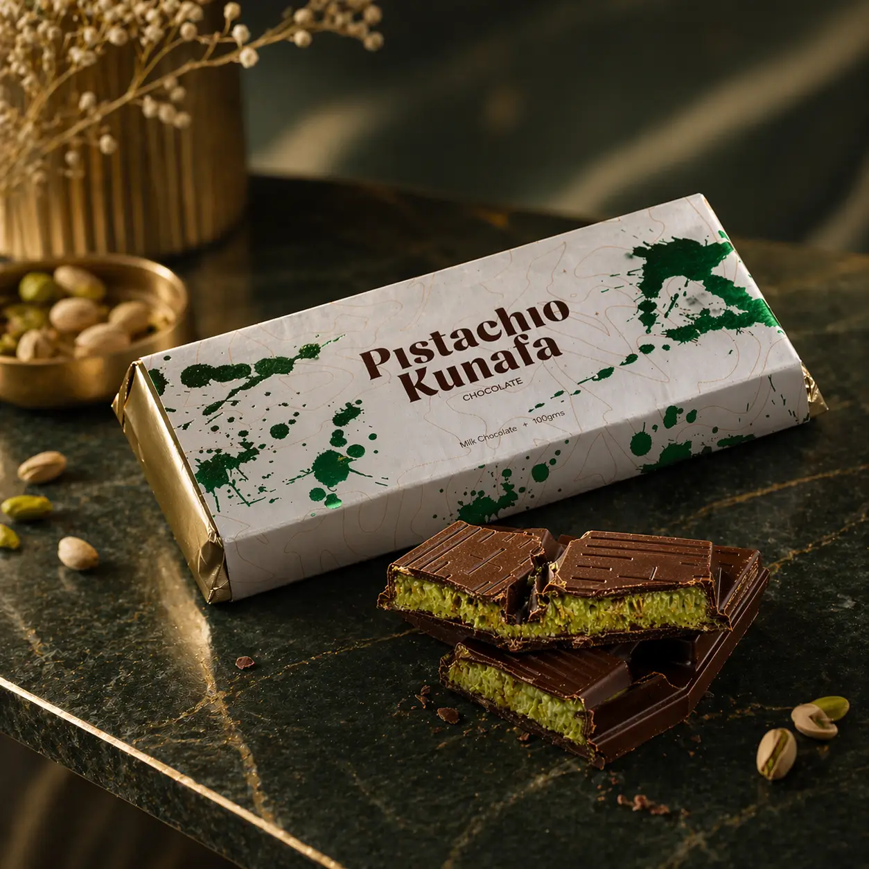 Each bite delivers a harmonious contrast of textures and flavours, from the crisp golden kunafa strands to the rich, nutty pistachio core, perfectly balanced with the creamy sweetness of fine milk chocolate. Crafted with precision and elegance, this chocolate bar transforms a traditional favourite into a sophisticated gourmet indulgence.
