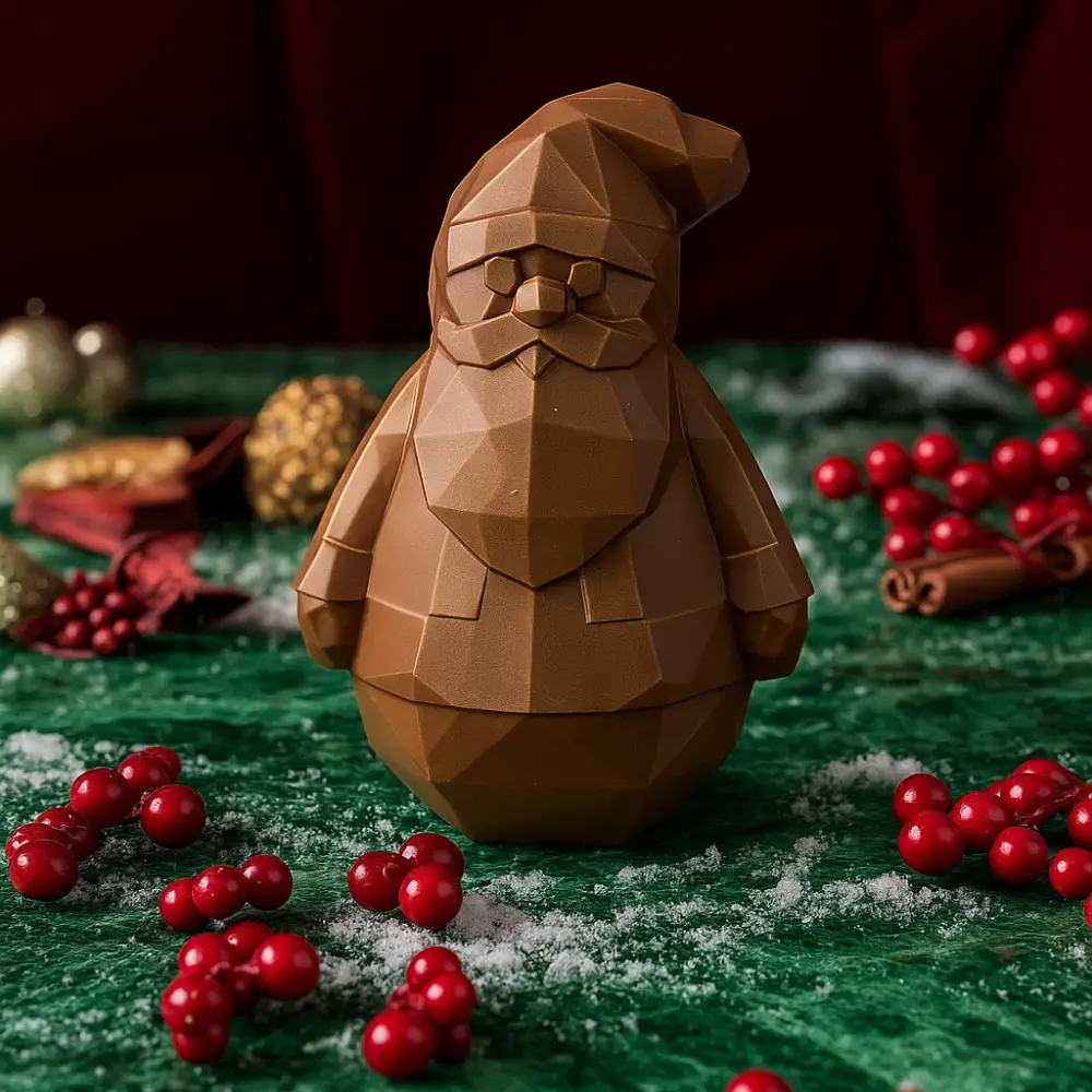 The AARAYA® Santa Diamond Chocolate Figurine is a striking expression of contemporary festive artistry, created for those who appreciate bold design, refined craftsmanship, and luxury chocolate gifting. Sculpted in a distinctive geometric “diamond” form, this premium Santa transforms a classic Christmas icon into a modern edible sculpture.