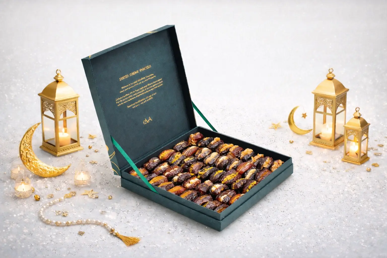 Perfectly balanced in size and presentation, this box is ideal for refined Ramadan gifting, corporate appreciation, and elegant Iftar moments. Each date is hand selected and artisan filled to deliver a harmonious blend of texture, flavour, and indulgence.