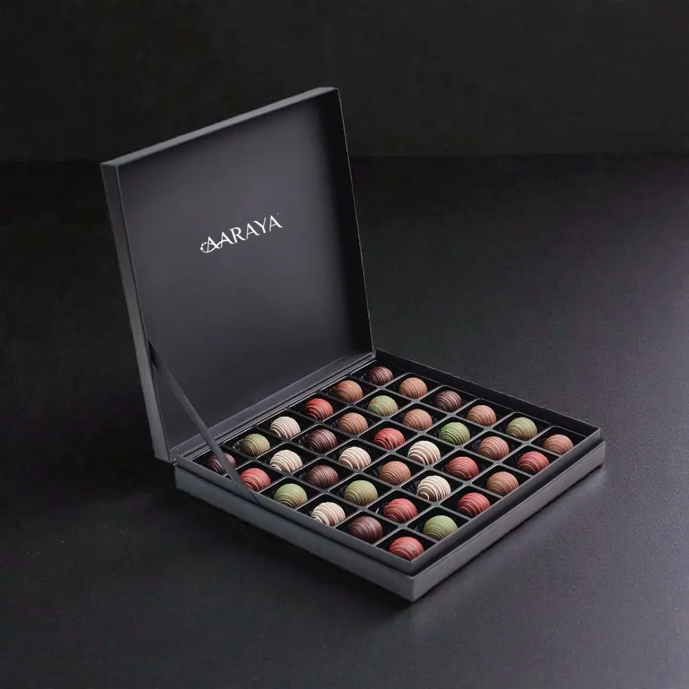 The AARAYA® Valentine’s Midnight Truffle Collection is a celebration of depth, refinement, and artisanal chocolate excellence. Presented in a sophisticated midnight luxury box, this collection features 36 handcrafted truffles, each meticulously created by AARAYA®’s master chocolatiers using fine ingredients and polished finishing.