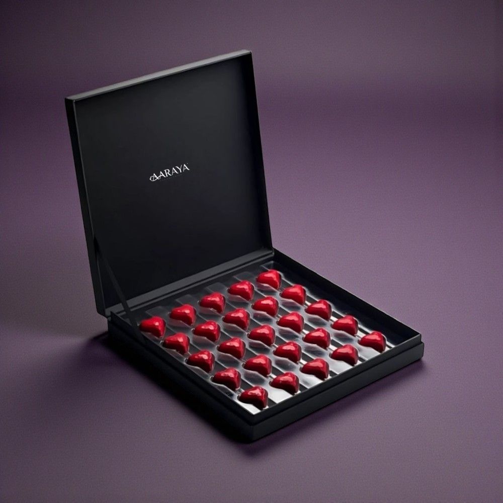 Crafted by AARAYA®’s master chocolatiers using fine couverture chocolate and balanced fillings, every piece delivers a smooth, indulgent tasting experience. The minimalist black box enhances the luxurious appeal, making it a timeless Valentine’s keepsake.