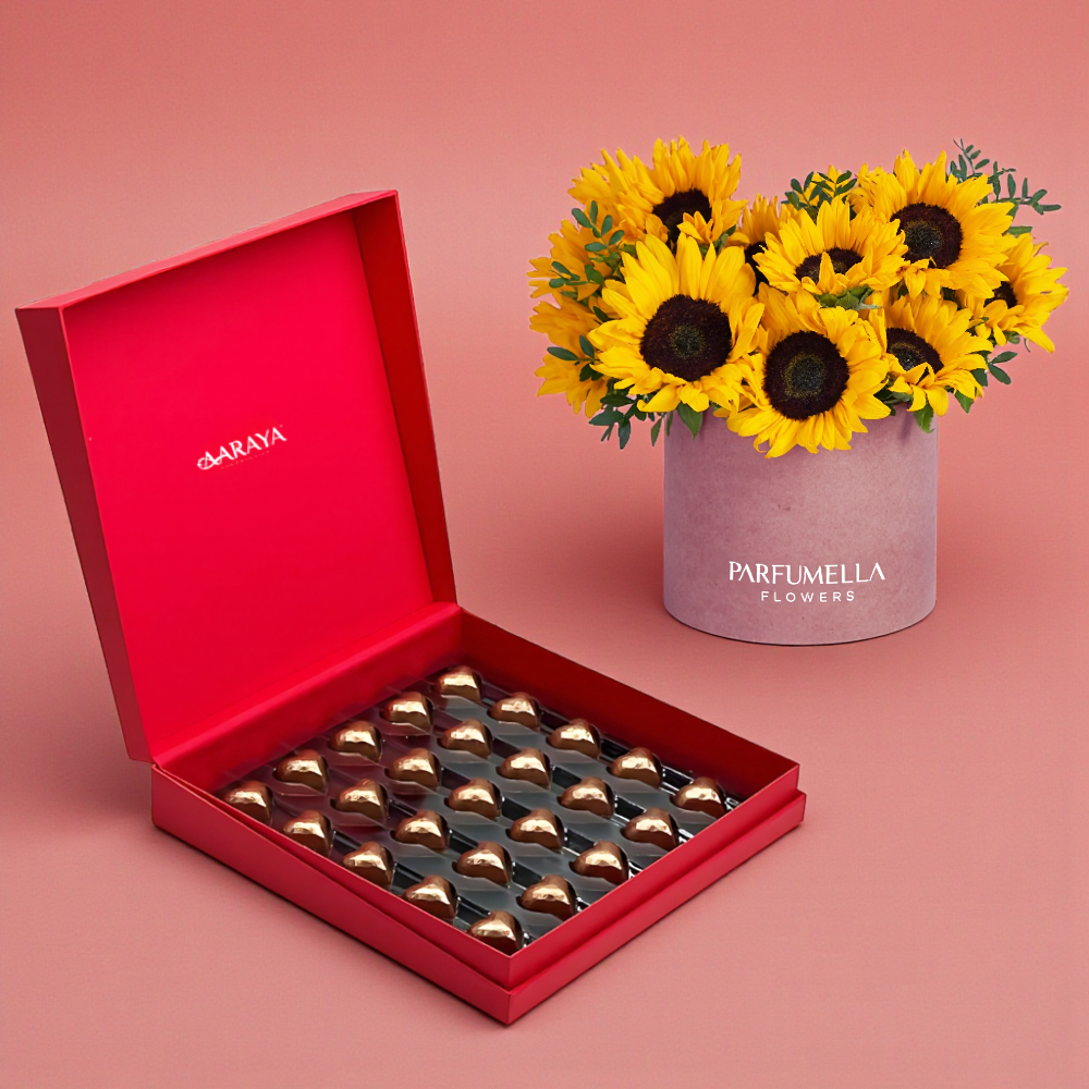 The AARAYA® Valentine’s Luxury Chocolate & Sunflower Celebration Box is a radiant expression of love, joy, and refined indulgence. Designed for those who appreciate meaningful gifting, this luxurious pairing brings together golden heart chocolates and vibrant sunflowers to celebrate Valentine’s Day with warmth and elegance.